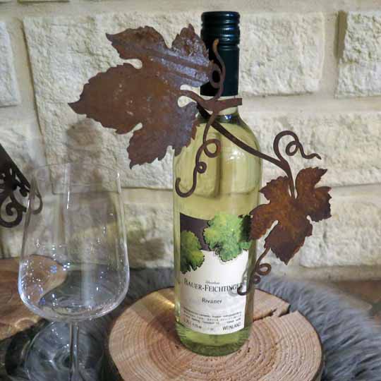 Zwei Weinblätter im Durchmesser von ca. 9cm, die mit einer Weinranke verbunden sind. Lässt sich ideal über einen Flaschenhals biegen.